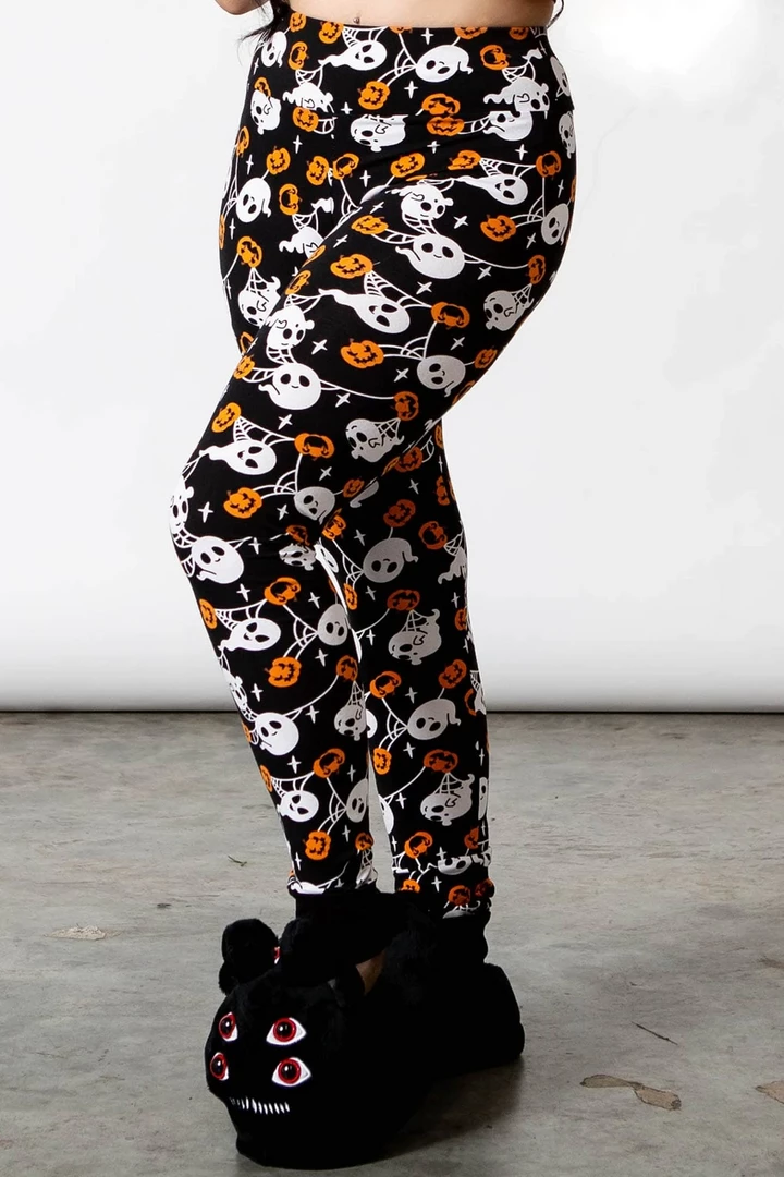 Keep it spooky and cozy and the super soft Haunted Pumpkin lounge leggings from Killstar! Perfect for lazy days, sleep-overs, naps and movie marathons, they feature an all over pumpkin and ghosts print with contrast cuffs and elastic waist. Complete the set with the matching cropped cami & check out the matching pet hoodie to coordinate with your familiar!