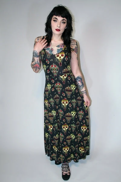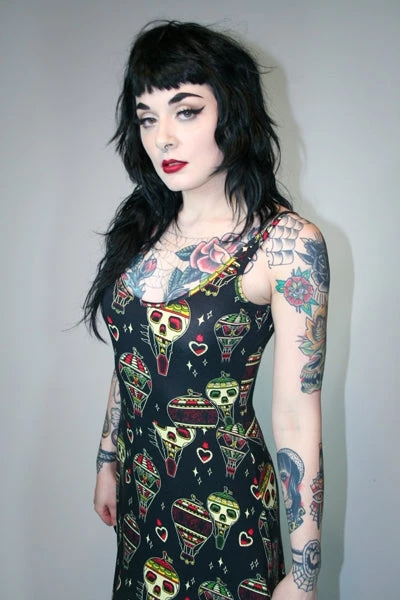 We might not be able to travel right now, but we can pretend in the new Bon Voyage Maxi Dress! This soft and slinky dress features an amazing macabre hot air balloon print in beautiful shades of green, red and cream. It is comprised of a soft, stretchy and lightweight rayon jersey that is an absolute dream to wear!