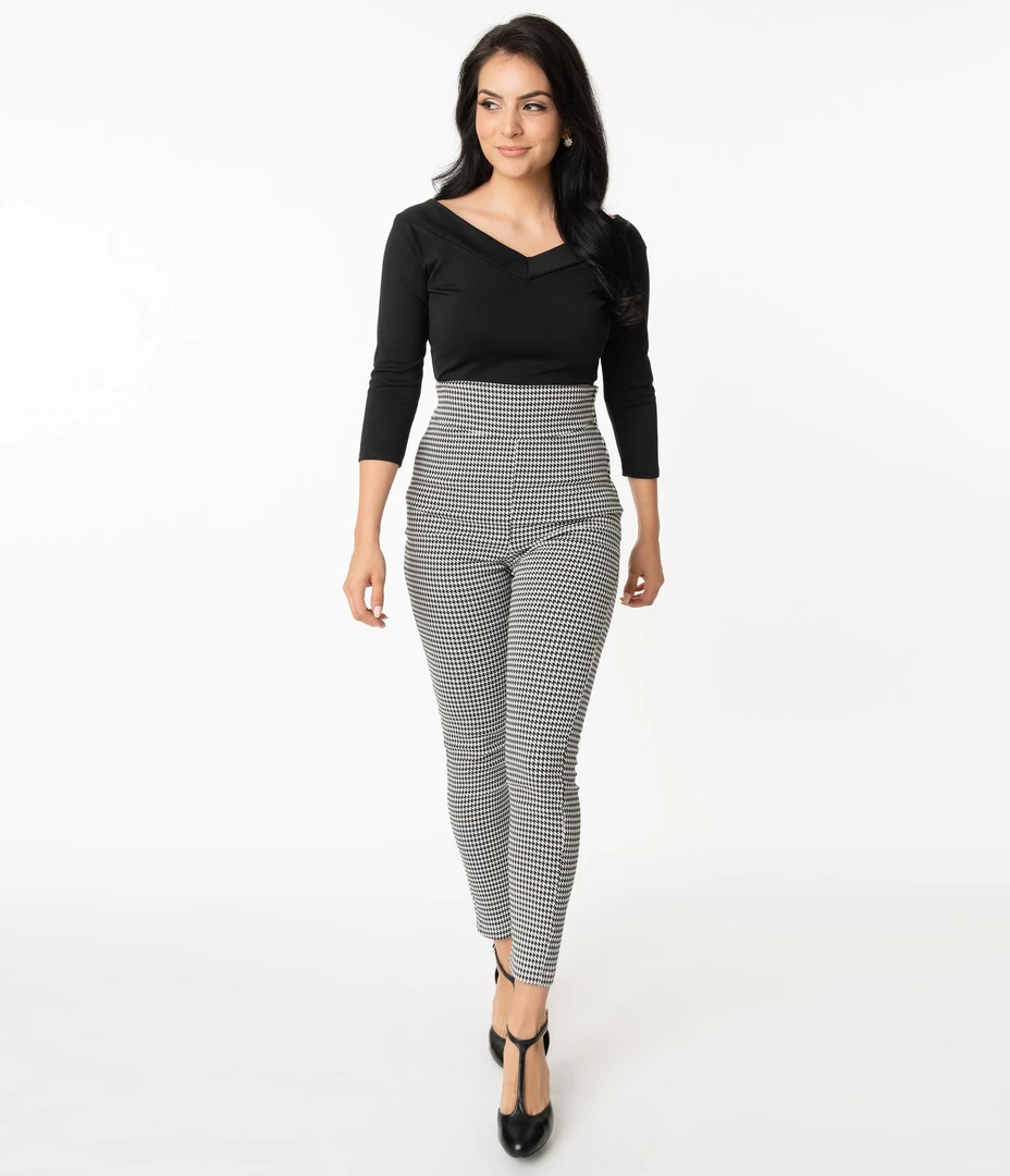 Houndstooth print is always the way to go! If you’re looking for the perfect pants, look no more! The Rizzo Pants from Unique Vintage feature a stretch fabric that not only is comfortable but also flatters. The classic black and white houndstooth pattern and dramatic high waist slims and elongates your figure in the best way. The cigarette skinny leg ends at the ankles, for the perfect retro look! Zips close at side.