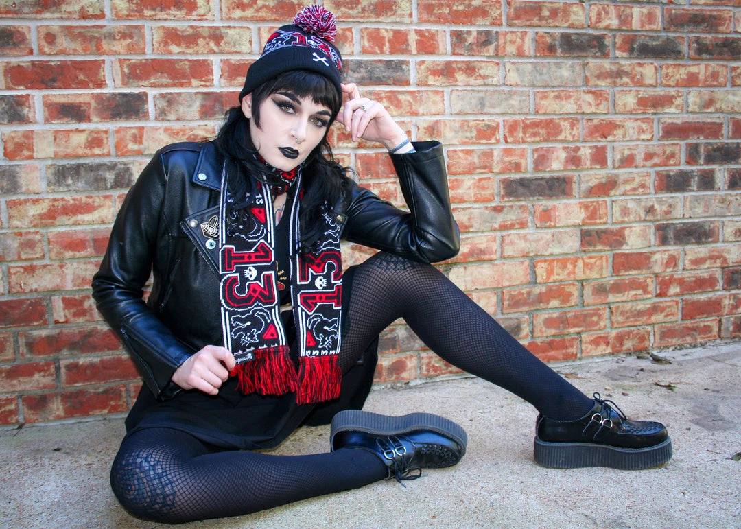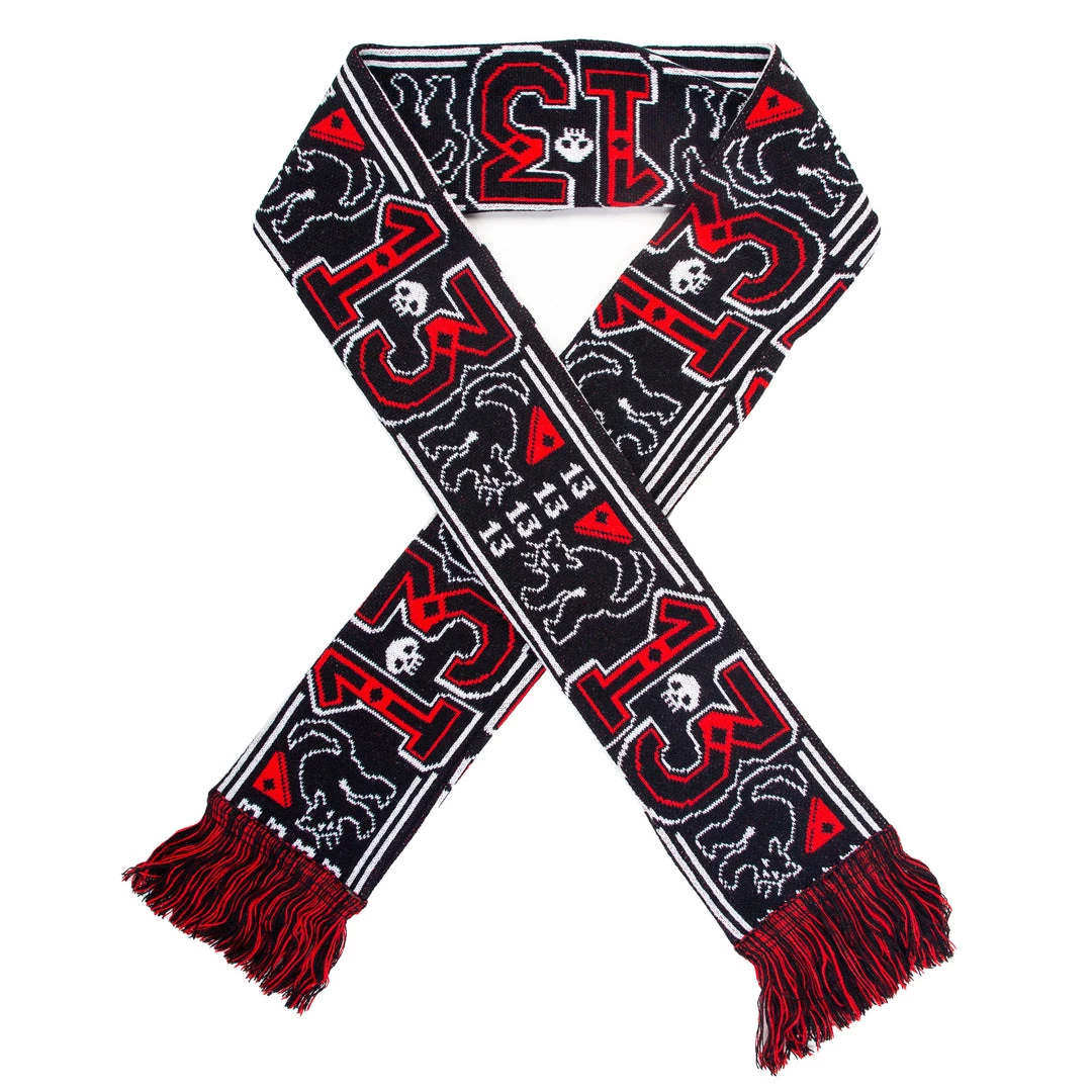 Look hot, all winter long! The 13 graphic is inspired by Friday the 13th, we made a graphic of the number 13, black cats, skulls and crossbones with black and red fringe detail.