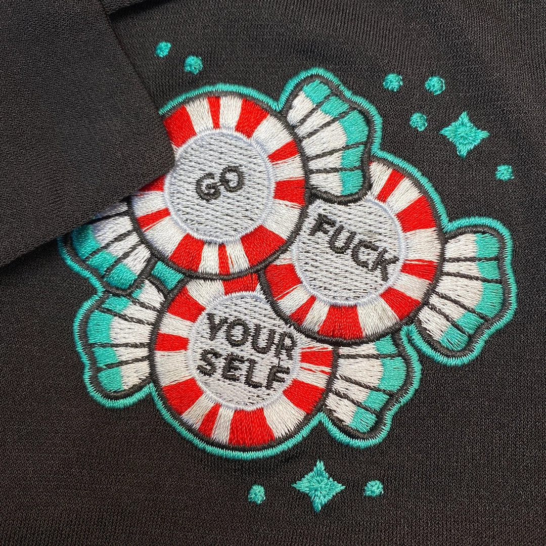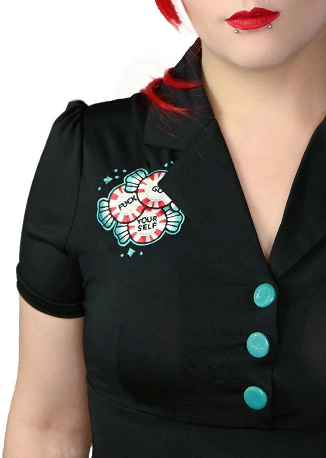 You don’t always have to be sugar and spice and everything nice… you can also be stylish, minty and mean! (That sounded better in my head.) Anyway, we’re continuing the Sourpuss tradition of putting our feelings on our chest with the new GFY Candies Rosie dress! Our best selling silhouette, yay!) and of course these absolutely perfect little “Go Fuck Yourself” Peppermints. This dress is super stretchy and ultra flattering, with a 1940’s silhouette and a-line skirt.