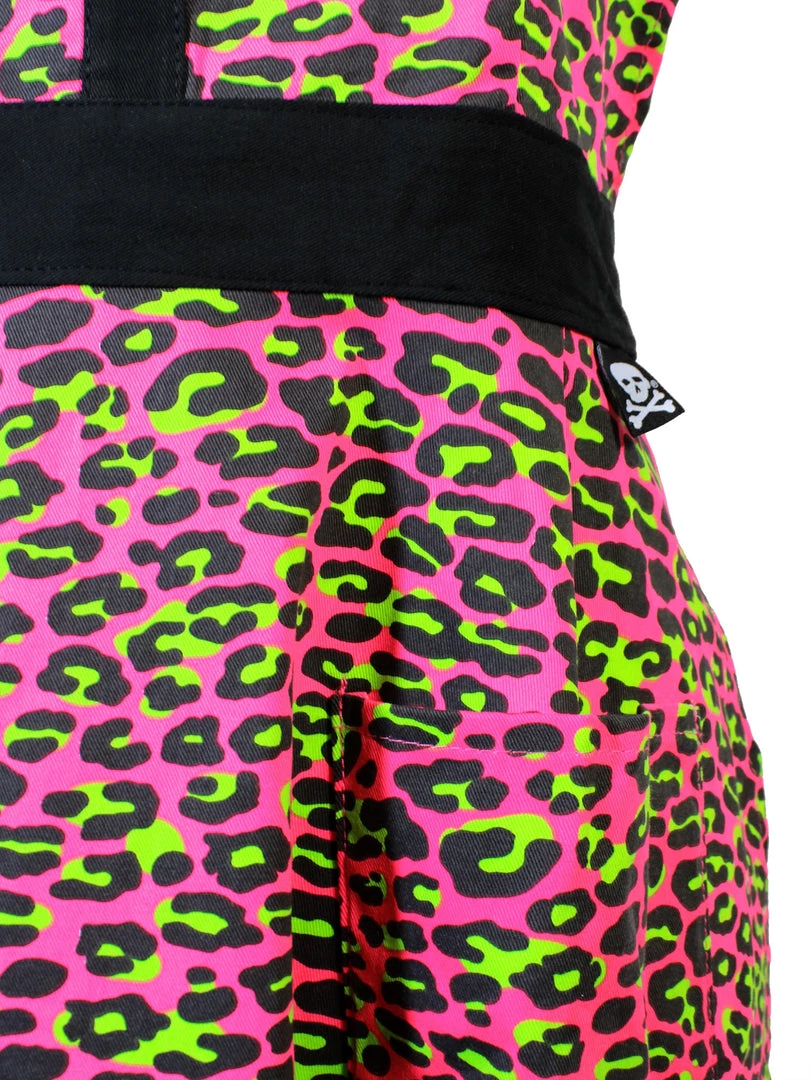 Finally! We have the perfect apron for all the punk rock kittens out there that like to cook. Blast some Lunachicks and make a soufflé! This cotton apron is in a bright pink leopard with pops of neon green, contrast red button detail and then trimmed in black. We’ve added pockets to hold your phone or recipes!