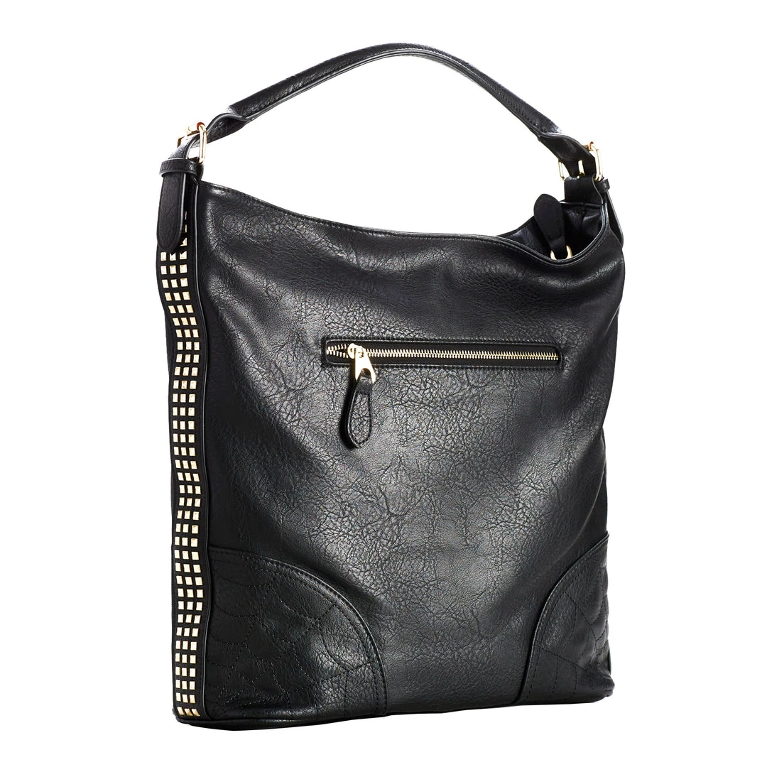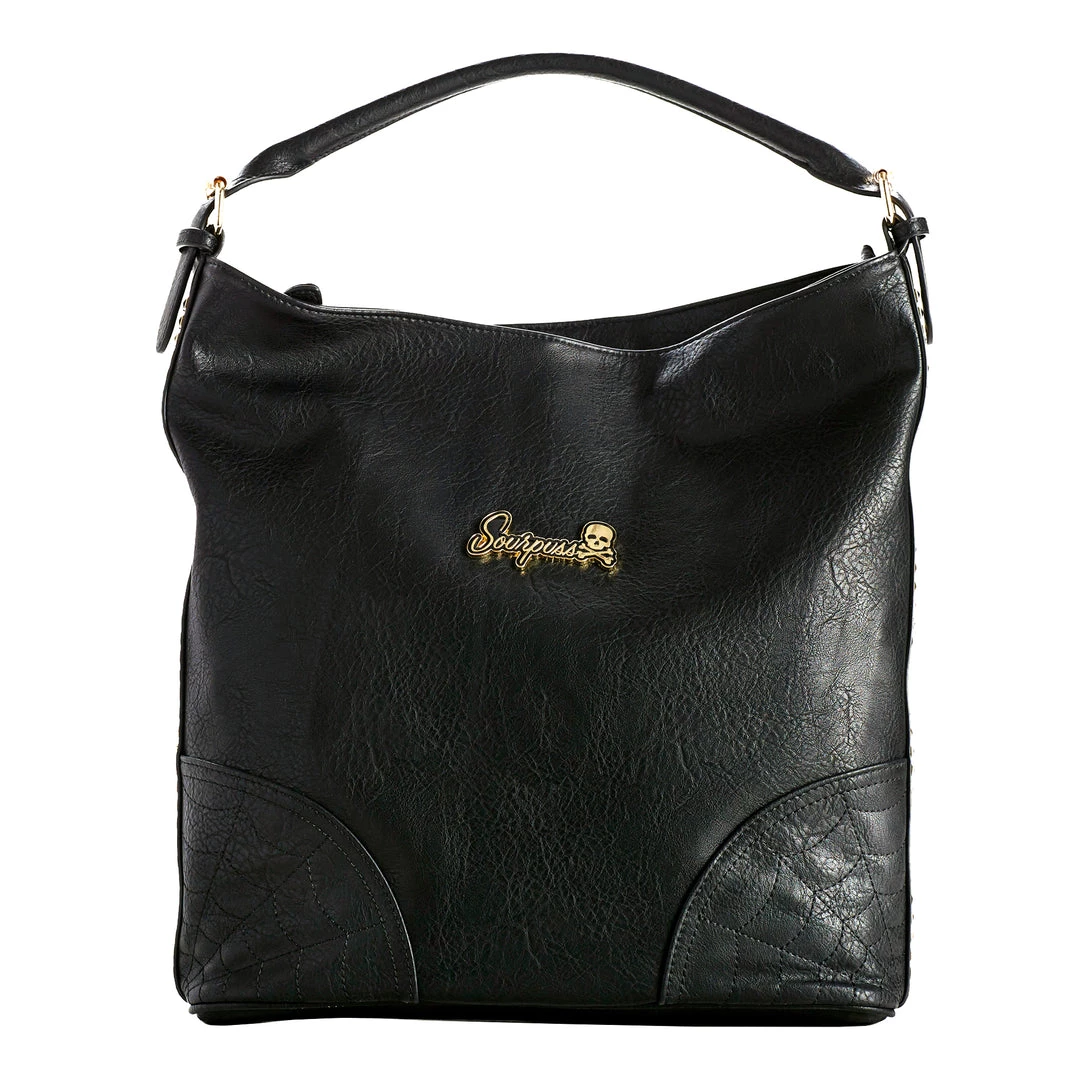 Our newest hobo purse is both subtly spooky and badass all in one. Crafted from a high quality faux leather in black, each bottom corner is accented with intricate spiderweb stitched details. The gold hardware accents continues to the sides where there are rows of mini pyramid studs for added edge. Roomy and comfortable to carry, it features an exterior zip pocket on the back as well as a big zipper pocket and two open pockets inside to keep ya organized!