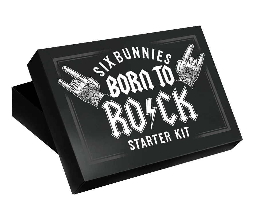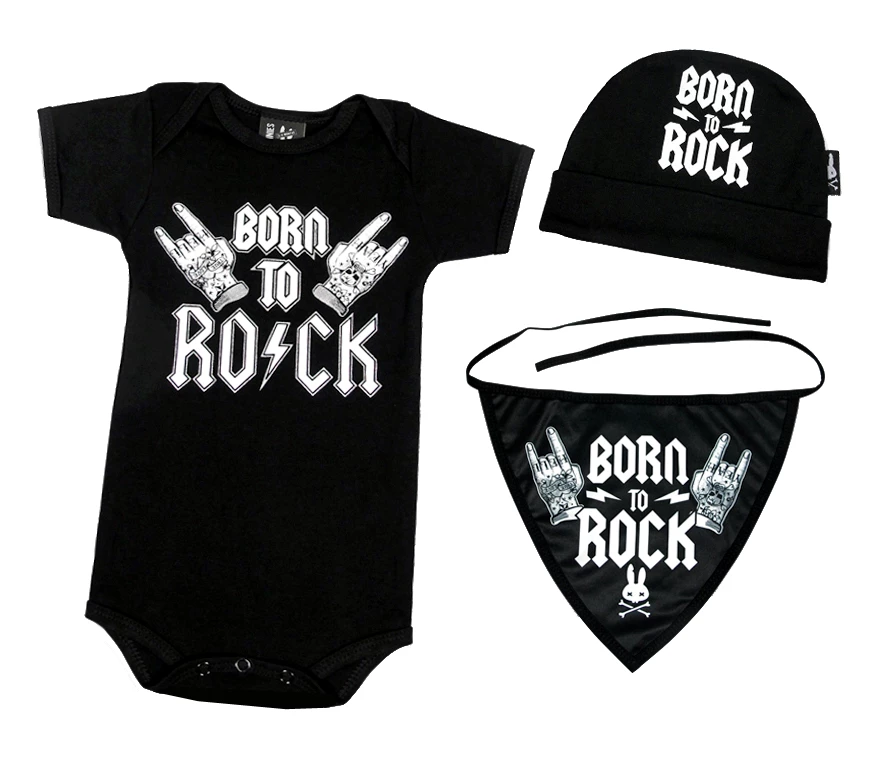 Get baby started on the track to awesomeness with this ready-to-gift set from Six Bunnies! The set includes a one piece, knit hat, and fabric bib, all with a coordinating “Born to Rock” graphic on black. Made of soft organic cotton, all three pieces come packaged up in a nice gift box and is perfect for any little one.
