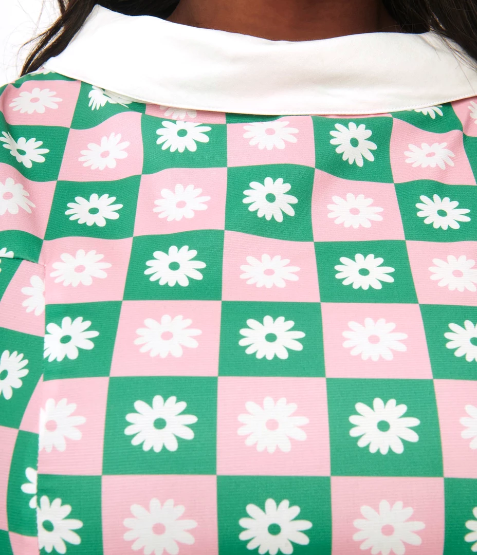 Checkmate! This fabulous 1960s inspired top from Smak Parlour is crafted in a sturdy woven fabric that dazzles with a green and pink checkered backdrop, complete with white daisies throughout. This sleeveless top is secured with sweet buttons down the back, just like your favorite vintage top! Pair with the matching mini skirt for the complete set!