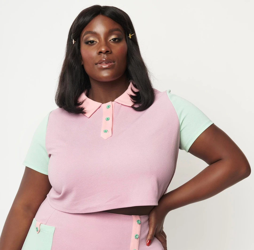 Pastel please! This adorable crop top from Smak Parlour is crafted in a lightweight fabric boasting a color block design in gorgeous lilac, mint, and pink for an eye-catching silhouette. Complete with a partial button placket (featuring the cutest flower shaped buttons!) and a cropped hem.