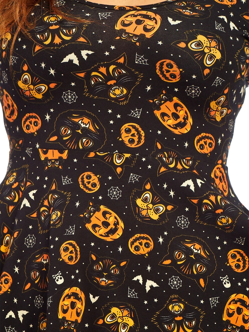 We love a little black dress, especially one with a Halloween theme! The Classic Halloween 3/4 Sleeve skater dress in black is THE perfect dress for the spookiest of seasons (and the rest of the year, too!) This stretchy cotton knit dress features our Classic Halloween art – bats, cats, pumpkins, oh my! It has a classic silhouette with a scoop neckline, flouncy skater skirt, and pockets! What’s not to love?