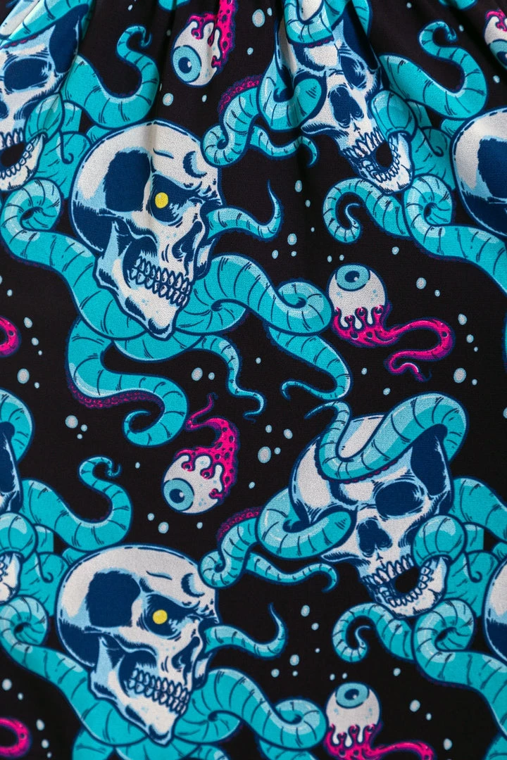 Sometimes, dead is better.. at least when it comes to our new Dead Sea Cream Puff dress! This floaty, dreamy dress features the art of Marcos Cabrera, created especially for Sourpuss – you won’t find this print anywhere else! The Cream Puff dress is a brand new empire-waist silhouette; with fluffy puff sleeves, a fully smocked back, and a waist tie, this one has all the bells and whistles you could possibly need!