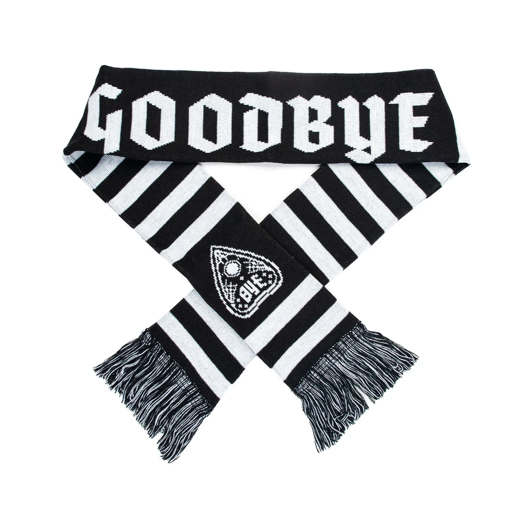 Goodbye! That’s the message you’ll see with this scarf wrapped around your neck. Features jacquard knit ‘Bye’ planchette design on each end of the scarf. Boldly designed in black and white stripes.