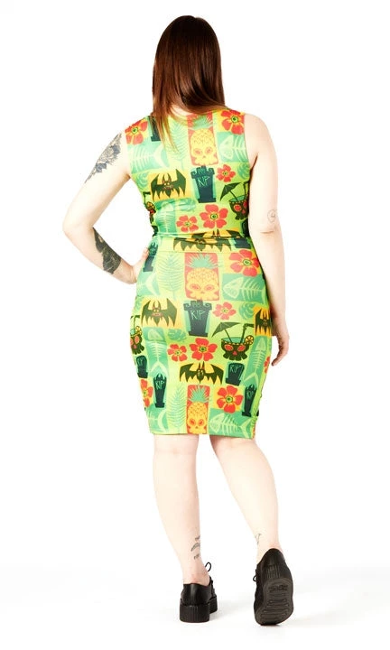 This is one of my favorite silhouettes. i love the low V neckline, the ruched waist and the slit detail in the front of the skirt. The fabric is soft and stretchy with a beautiful creepy tiki pattern by Philly artist Kelly Migliori. Vivid colors on the bats, flowers and tikis makes this a perfect mash up of your dark side and love of summer cookouts.