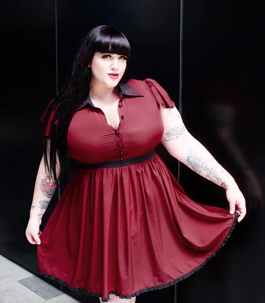 We’re absolutely obsessed with our newest Lydia dress! The Lydia dress in burgundy is the ABSOLUTE perfect shade of crimson red, and it’s destined to become a wardrobe staple. This dress has a slight amount of stretch/give, an invisible side zipper, and pockets! The spiderweb embroidery at the collar and the sweet flutter sleeves are just the icing on a very perfect cake!