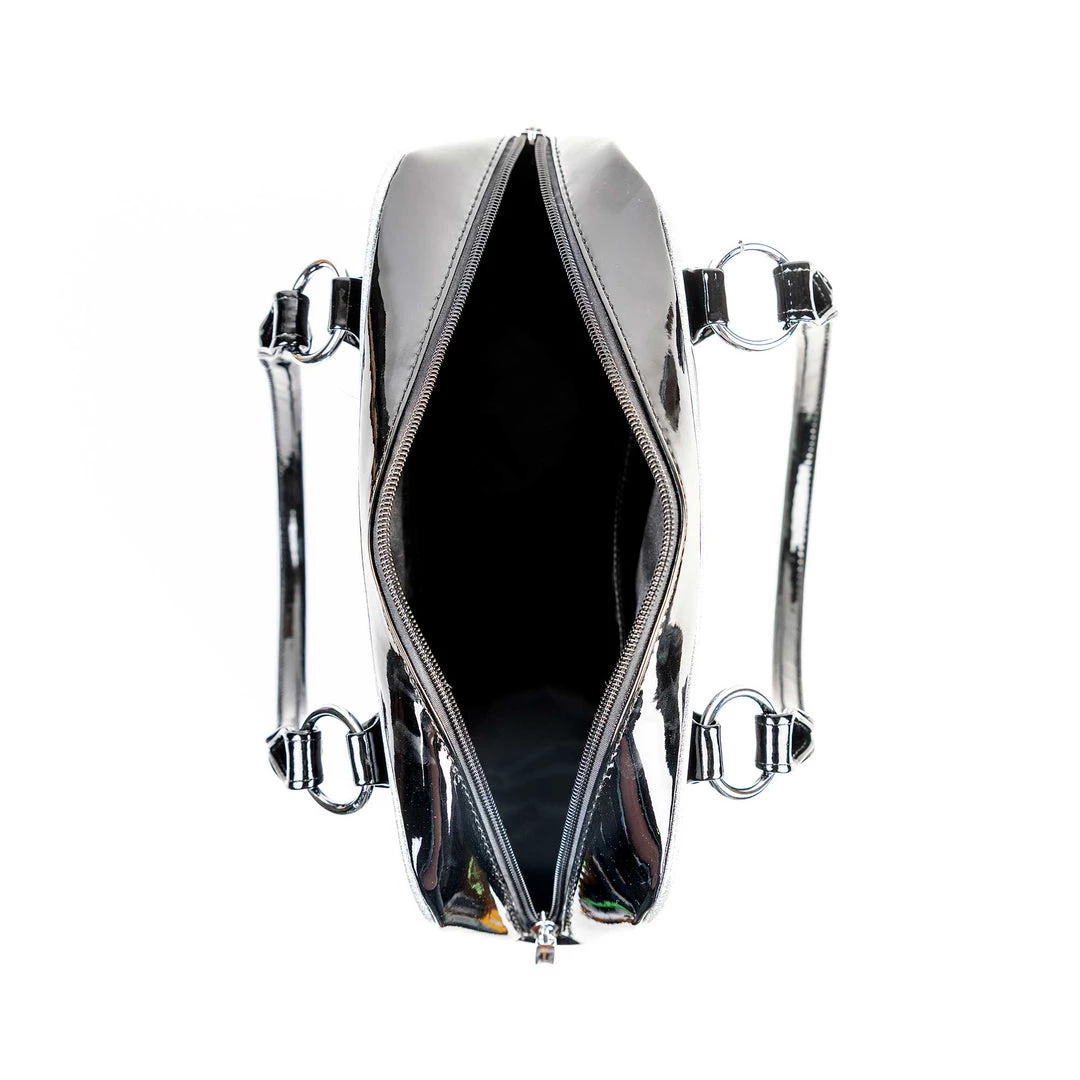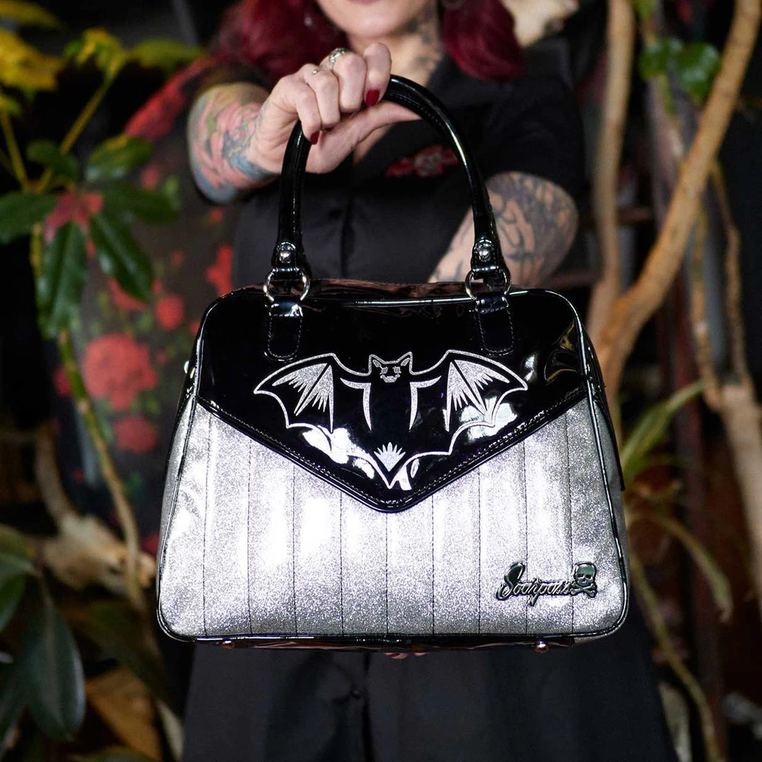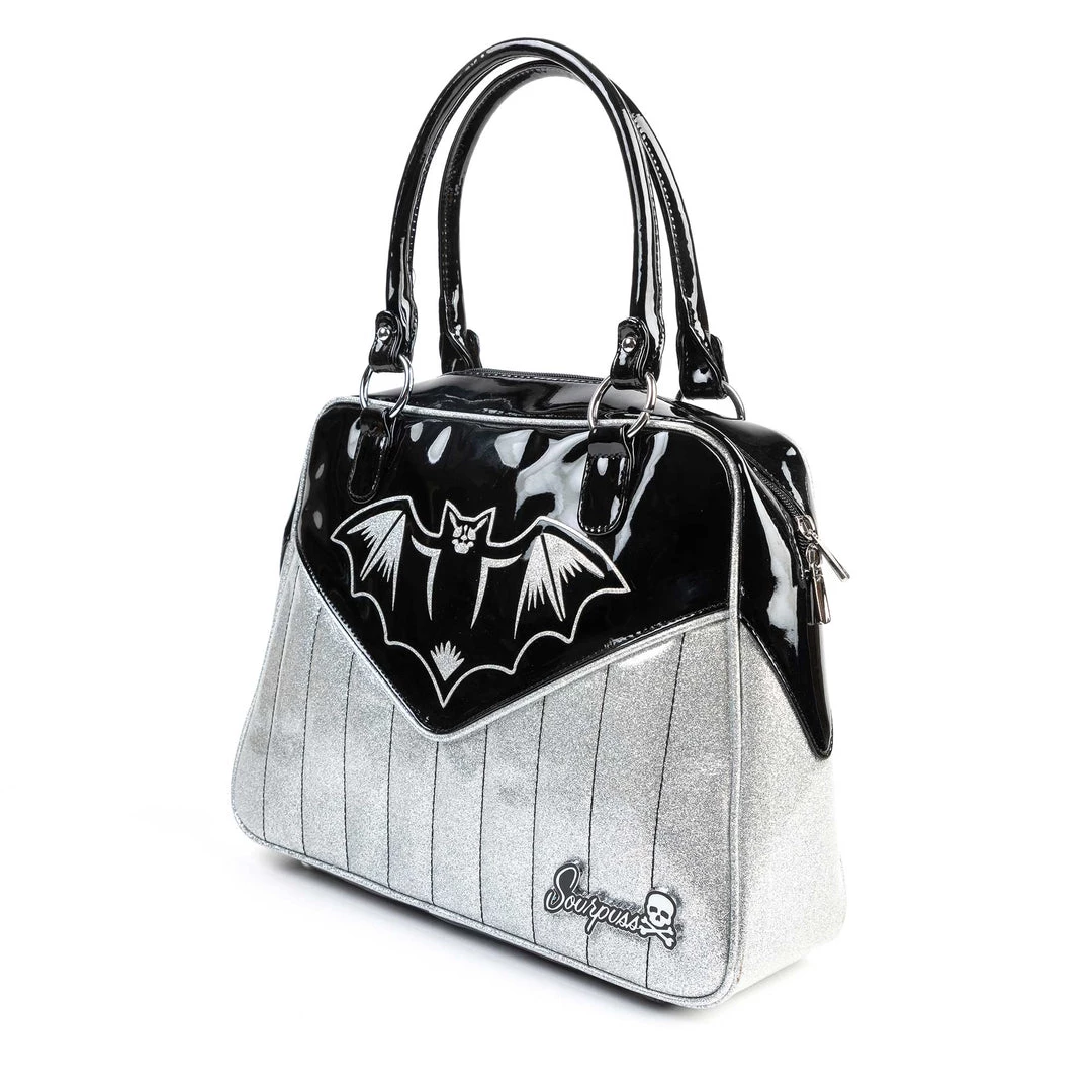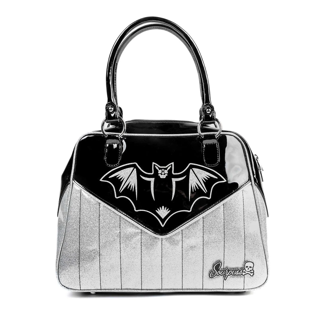 Haunt the night with our fabulous new Nokturnal Bat Bowler Purse in silver. The tuck and roll style upholstery inspired front is made out of killer silver glitter vinyl with our popular Nokturnal Bat artwork above and Sourpuss logo hardware. The vintage inspiration continues with matching glitter piping and glossy black vinyl accents. The interior is fully lined with multiple pockets to keep your essentials close by and easy to find. Top zips close and the sturdy handles make for easy carrying.