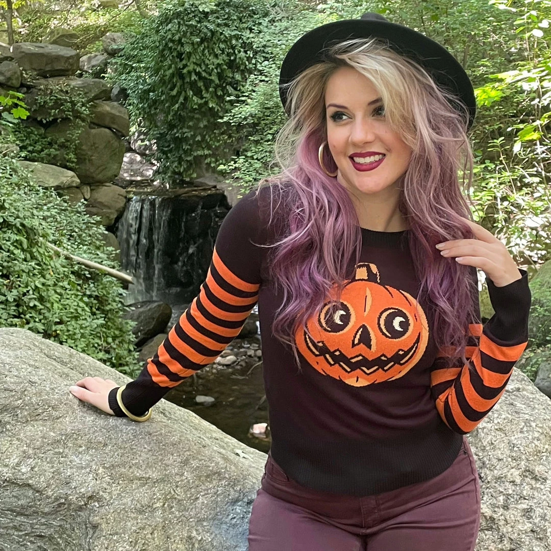 We can’t get enough of this classic little jack o lantern! The new Pumpkin Stripe Sweater is made from the softest viscose yarn, and features a classic collegiate style striped sleeve. It’s ultra stretchy and cozy, and pairs perfectly with any bottoms that you like!