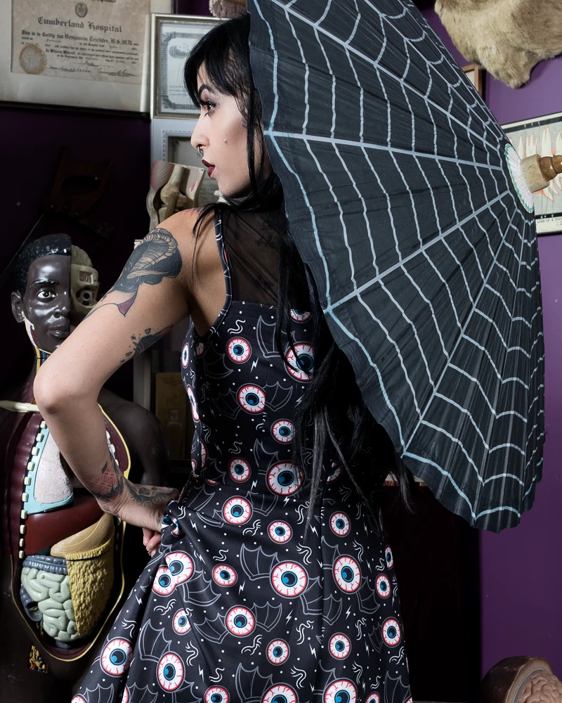 Stay out of the sun in style and make sure you keep that pale skin the proper deathly pallor with our spiderweb parasol! Made of non-oiled paper with a wooden handle.