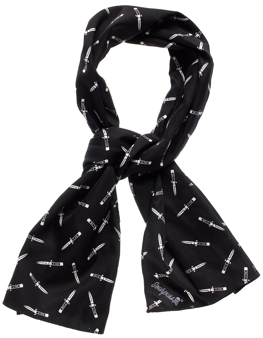 If you’re sweet but dangerous, then you might be a Bad Girl. Our newest silky scarf is ideal for the gal who’s adorable but a little deadly, with an all-over switchblade print that’s too sharp to pass up. It’s the perfect accent for your hair, neck, handbag, or even your home!