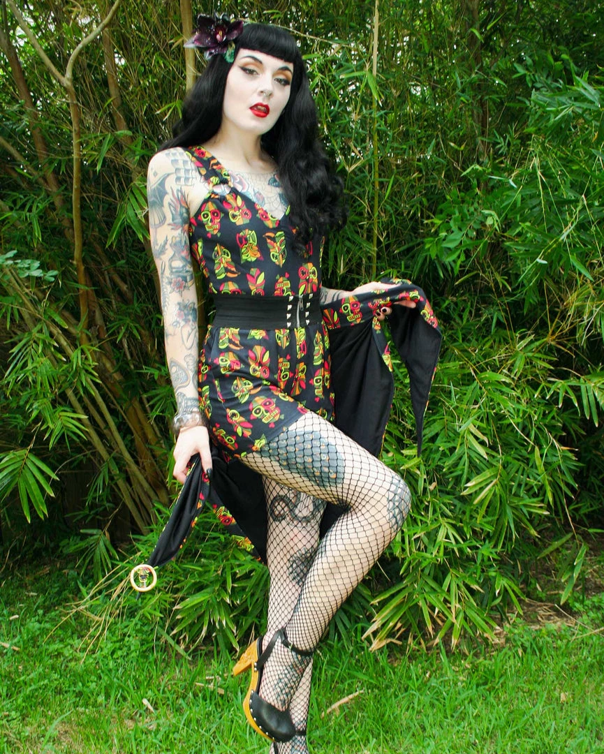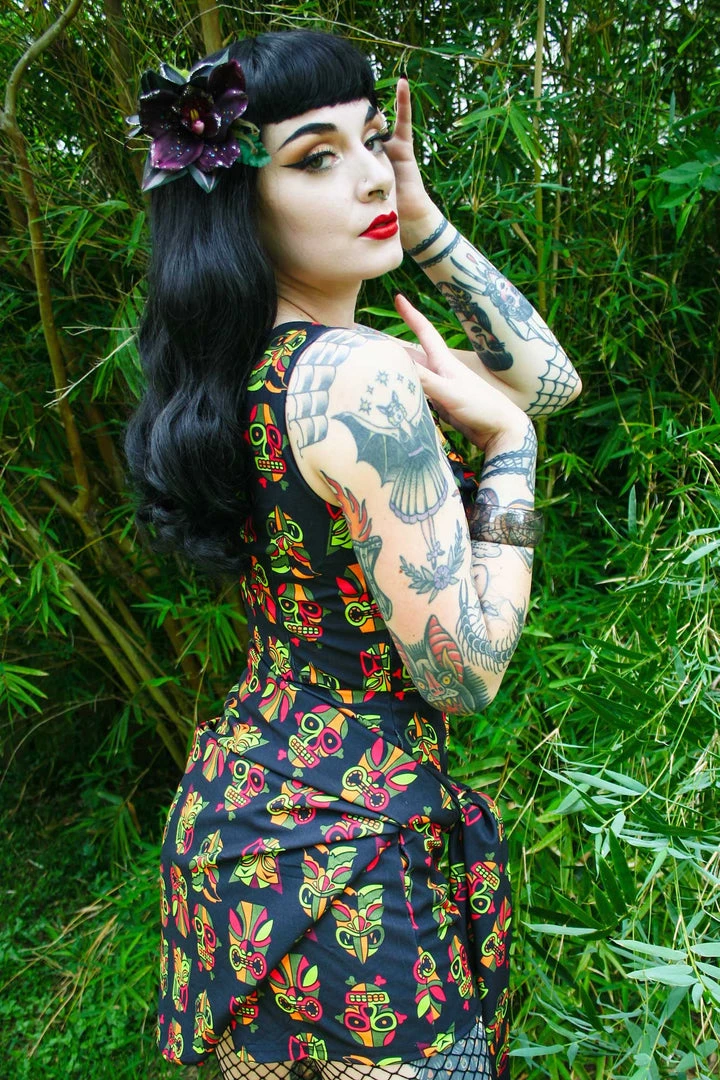 If you need to add a little more tiki to your wardrobe, the Tiny Tiki Sarong Playsuit is the way to go! We absolutely LOVE the neon tiki masks on this fun print!