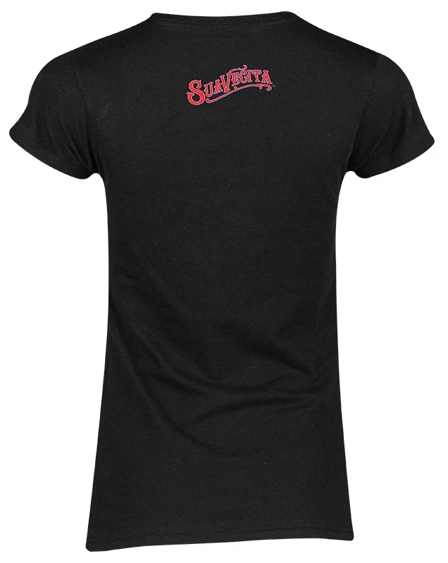Part of their Loteria collaboration, this La Calavera Tee from Suavecita is an instant classic! Front has a large loteria skull, back top has a small Suavecita logo, printed on a soft, black, fitted tee.