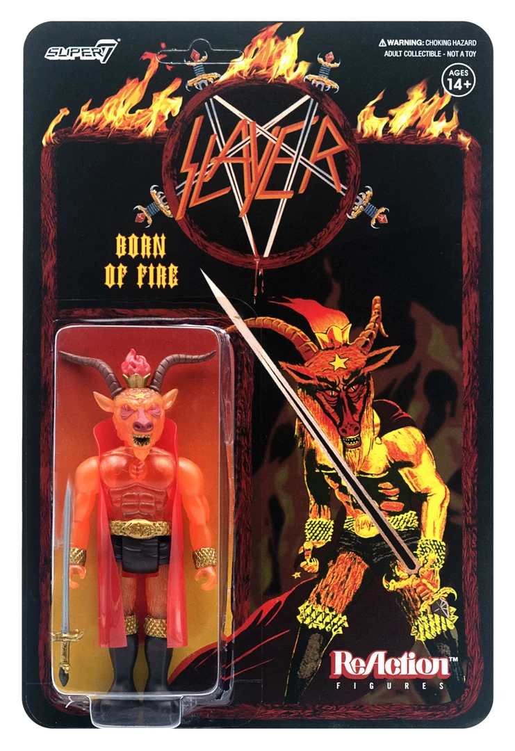 SLAAAYEER! This official Super7 x Slayer 3.75-inch ReAction Figure was inspired by the band’s 1990 song “Born Of Fire”! The figure is translucent orange on a flame-enhanced cardback. It includes a cape and sword accessories.