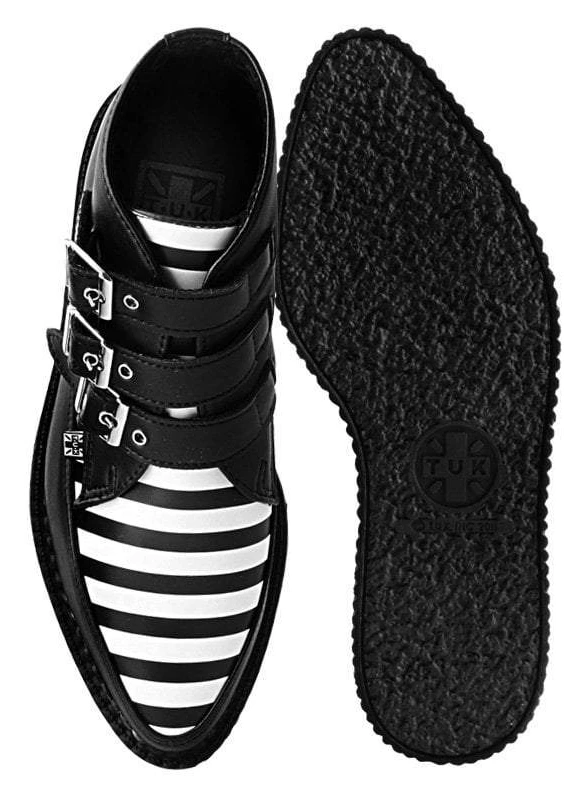 A vegan friendly style to kickstart your week! Buckle up in fierce style with these creeper boots featuring a vegan friendly black and white striped upper. Triple buckle strap closure and has a low sole creeper platform that measures 1.25” at the heel and .75” in the front and has removable memory foam insoles for added comfort.