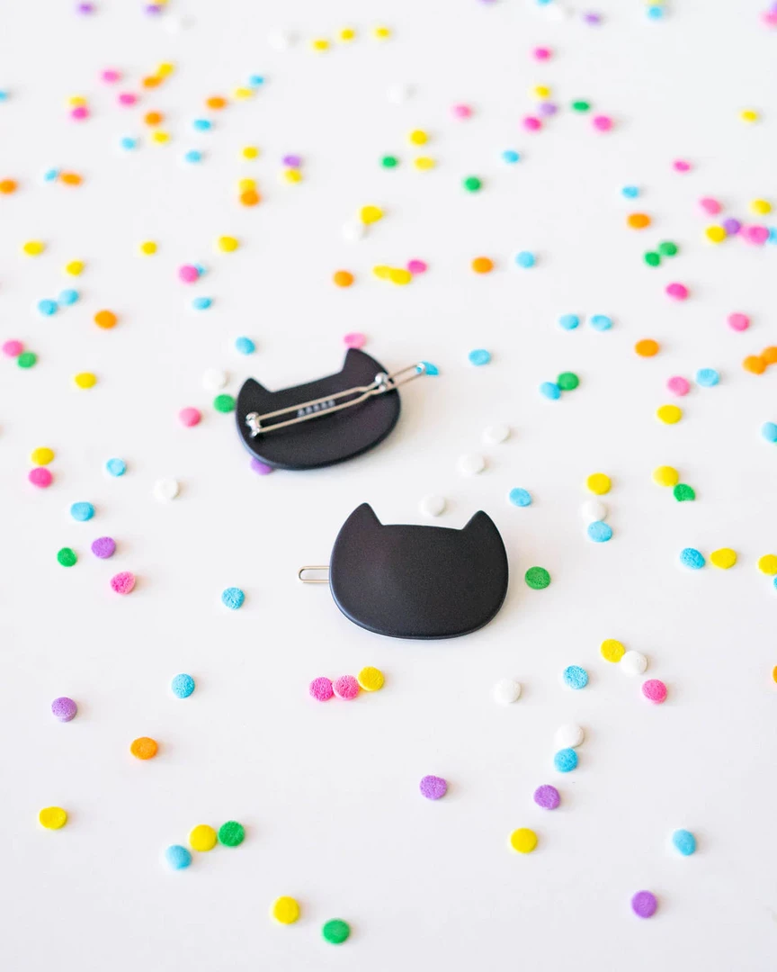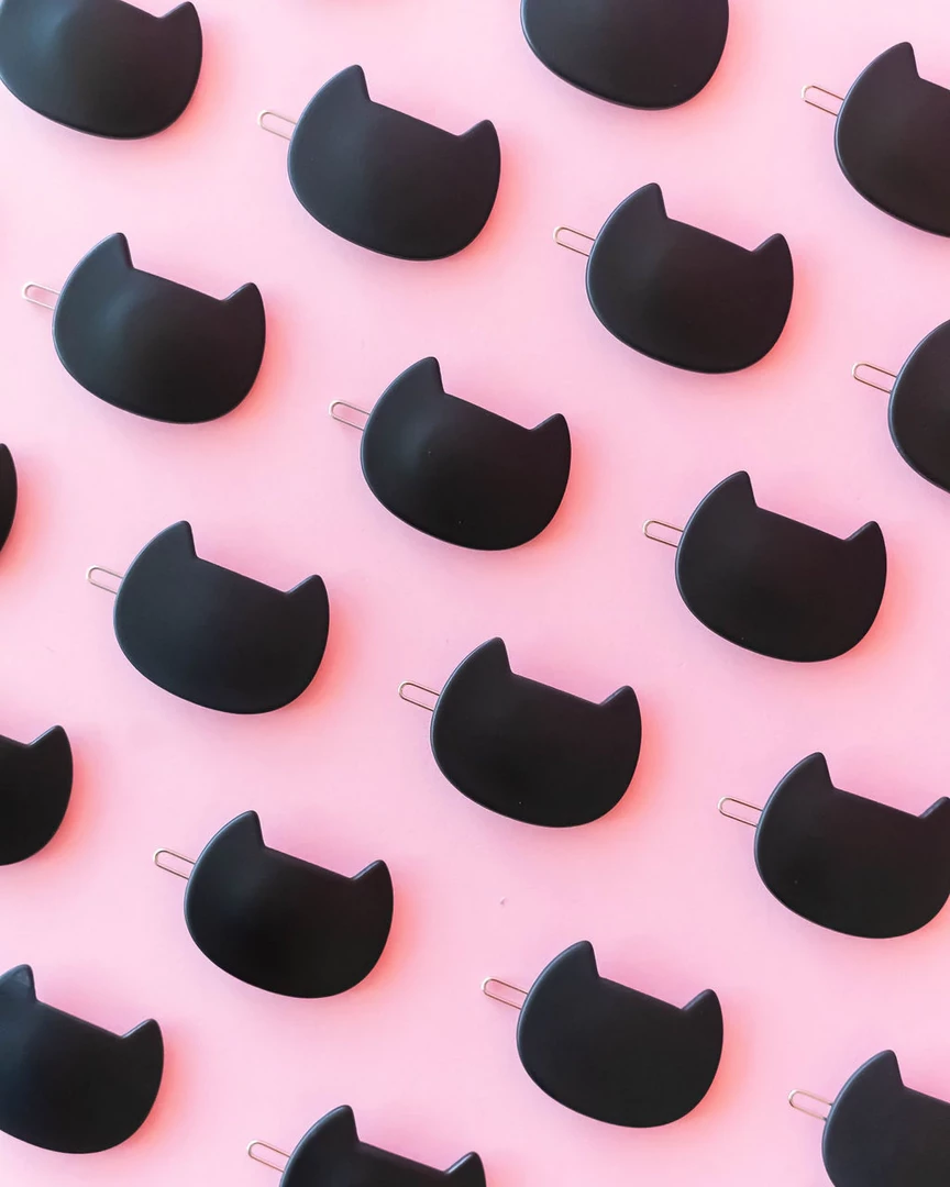 Give a subtle spooky nod to any outfit with this adorable Black Cat hair clip from The Pink Samurai. Made of a matte black acetate, it holds well in any hair type.