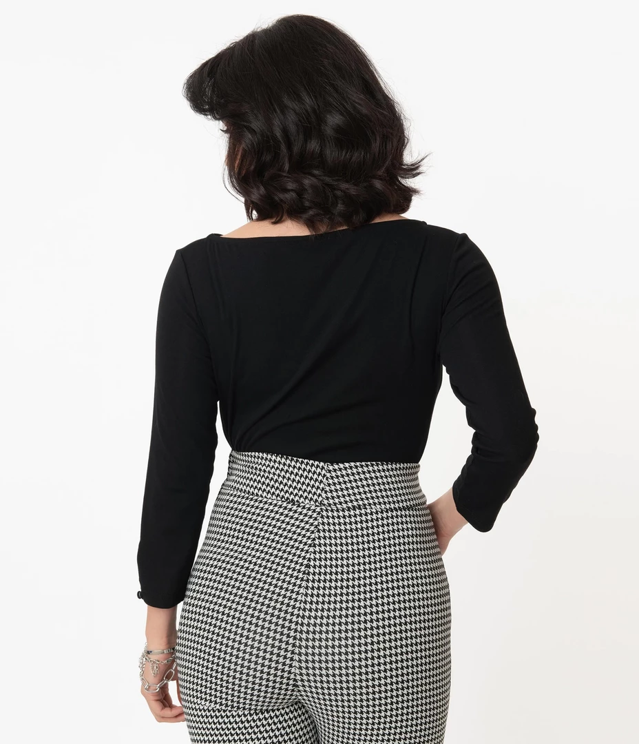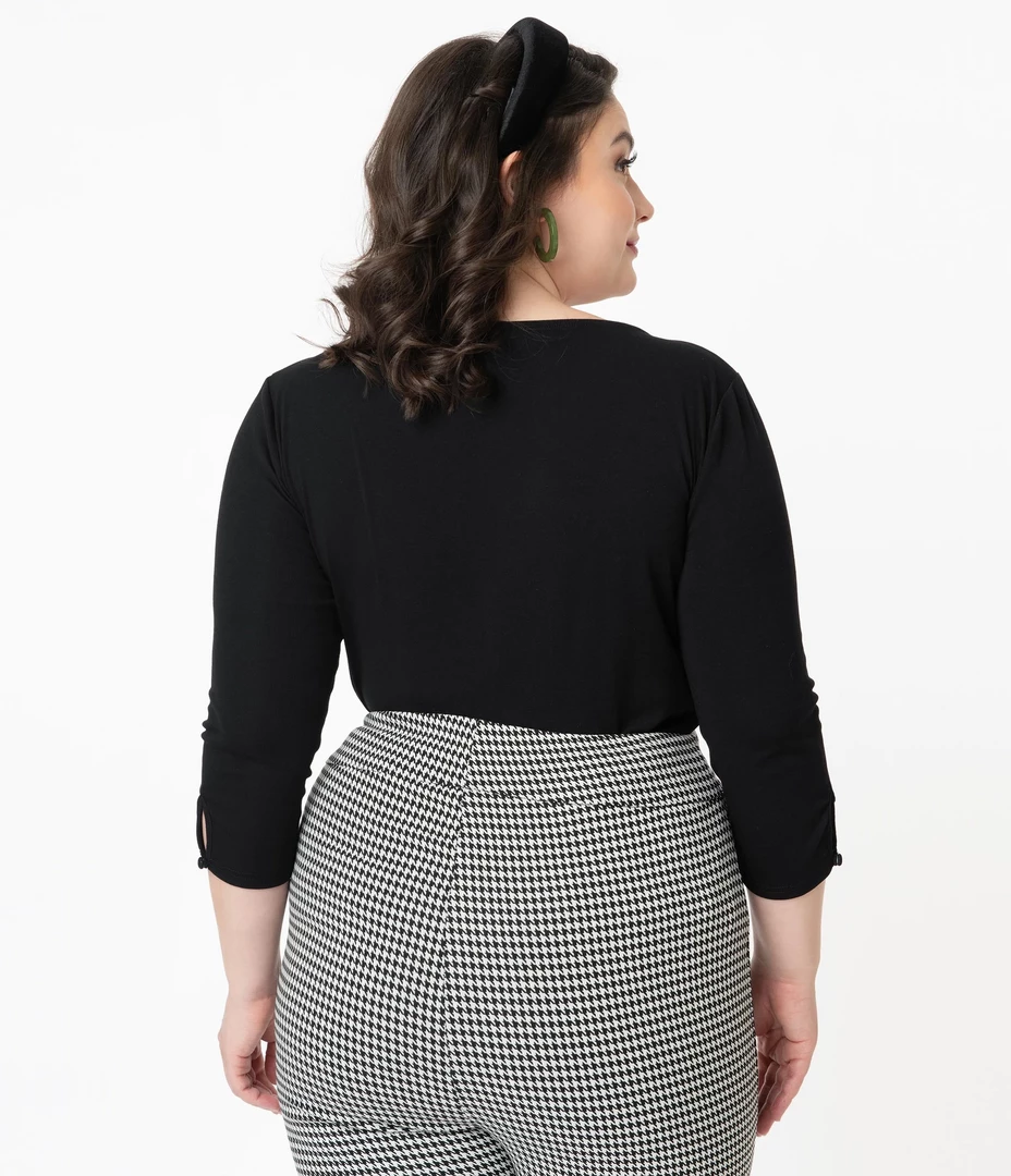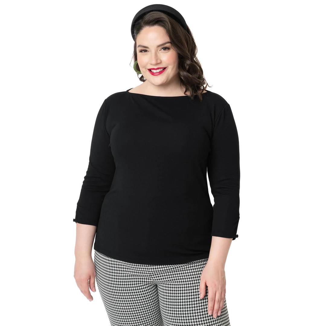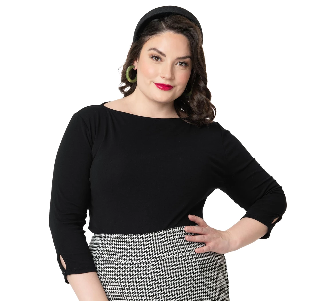 Truly a classic for every closet! This black top from Unique Vintage pairs amazingly with all of your favorite bottoms to make the perfect outfit. The Gracie Top is crafted in a soft knit blend that stretches perfectly around your form. The three-quarter length sleeves feature a button keyhole for the perfect delicate touch!