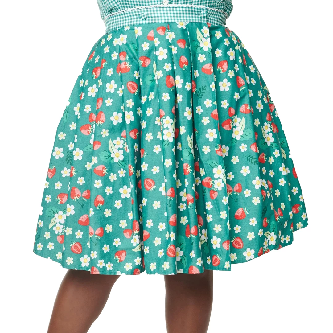 Strawberries and gingham together? Yes please! For a fresh take on a classic, the Collins Skirt from Unique Vintage is crafted in a lightweight cotton that flows around your form in a full wrap design and dances with a sweet print of red strawberries and white florals cascading through a teal green backdrop. The banded waist is a playful green gingham and secures with dual buttons while the skirt is complete with side pockets for snacks and other important necessities! Pairs perfectly with the Shelby Romper – also available!