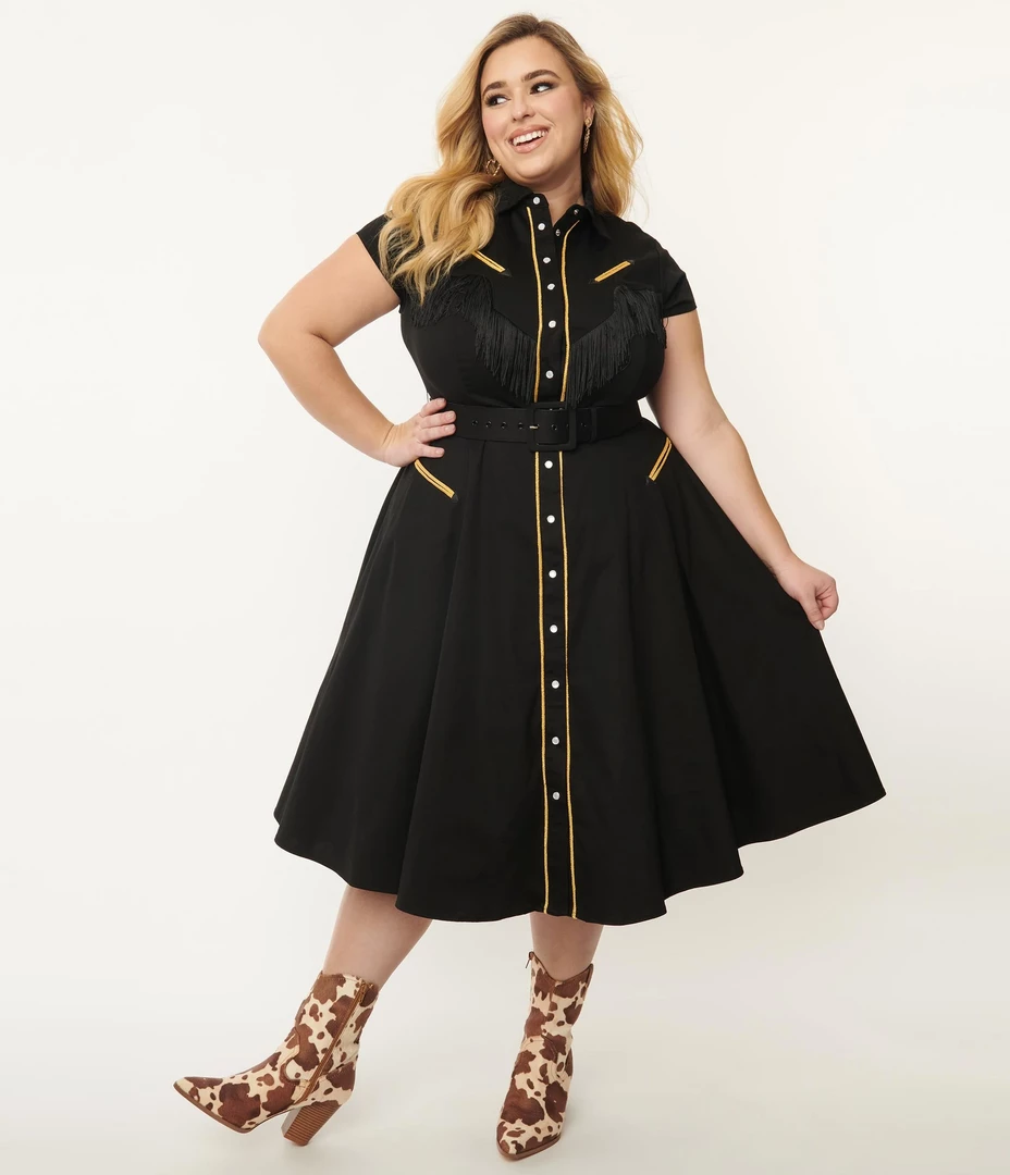 Yeehaw! Get ready to kick up your boots in this gorgeous western inspired Madeline swing dress from Unique Vintage. Crafted in a sturdy cotton with a nice weight to it in solid black with golden accents, it features fringe, side pockets, and a wide matching belt. The snap button up front is functional the whole way down.
