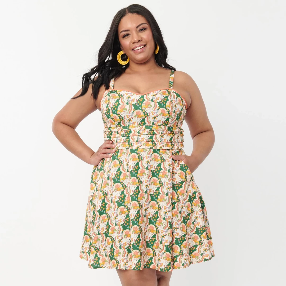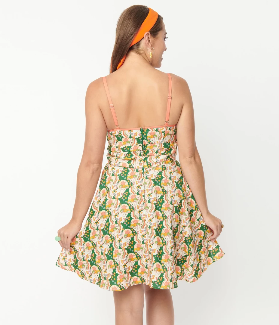 Put a spring in your step with this charming Follow Your Heart Fit & Flare Dress from Unique Vintage! Crafted from a 1960s inspired mushroom, rainbow, and daisies print over a green backdrop, this sweet silhouette is perfect for warm summer days. The sweetheart neckline is secured with adjustable spaghetti straps while the pleated waist is cinched with a back zipper. The sweet flare skirt is outfitted with side pockets for modern function while contrast orange piping lends a dash of embellishment!