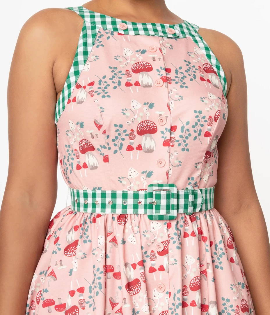 Pink, mushrooms, and gingham?! Yes please! This vibrant mid-century inspired Maxine Swing Dress from Unique Vintage features a fun print of marvelous mushrooms on a pretty rose pink backdrop. The princess seamed bodice is embellished with a contrast green gingham neckline and sultry open shoulders while faux buttons provide a retro accent. The seamed waist can be cinched with the included green gingham belt as the gathered skirt is outfitted with side pockets for modern function. Fastens at the back with a zipper.