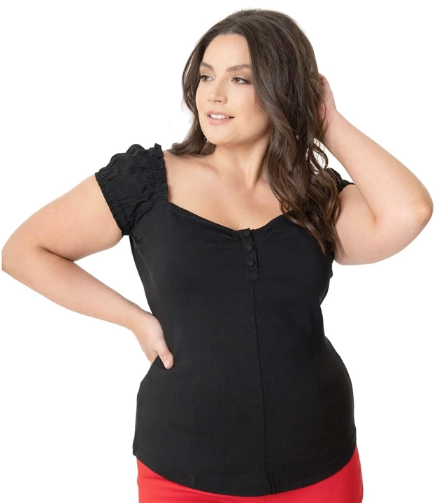 Unique Vintage has made an adorable black top with a bardot sleeve, sweetheart neckline and 3 button details. The fabric has a nice amount of stretch.