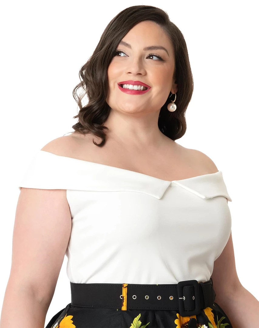 Watch the love letters pile up with the Maraschino Top from Unique Vintage! Crafted in a stretchy ivory white fabric, the fitted form highlights your feminine figure while the sultry off the shoulder neckline is embellished with a foldover and notched collar that provides sweet Bardot sleeves. Structured with a tapered silhouette, this summer ready top is a perfect accompaniment to your favorite capris and skirts!