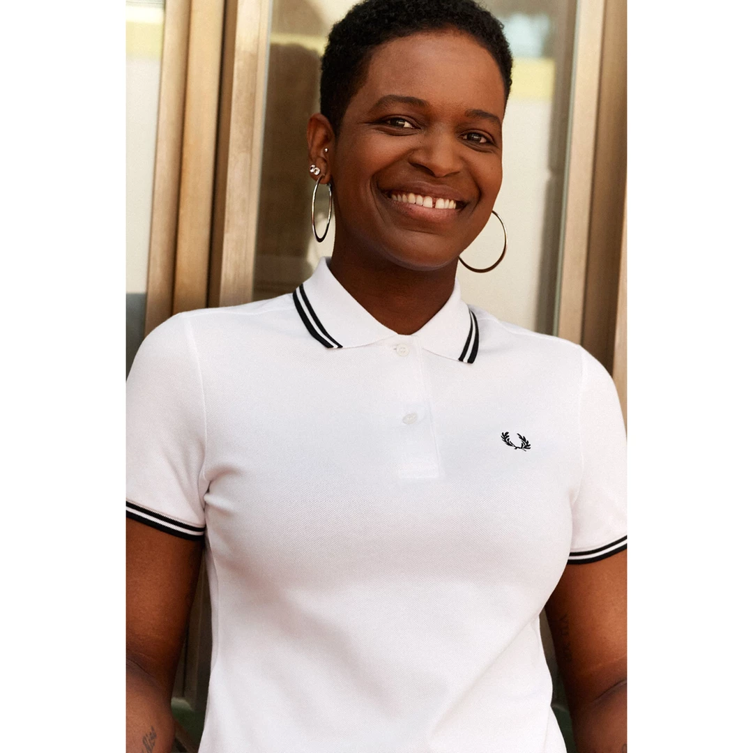 This white polo with black tipping on the collar and sleeves has the look of the original Fred Perry shirt but updated with a small amount of elastane for a better fit. In keeping with classic Fred Perry style, this shirt has the standard twin tipped collar and sleeves and a two-button placket and pairs perfectly with a skirt or jeans. **Listed in US Sizing!