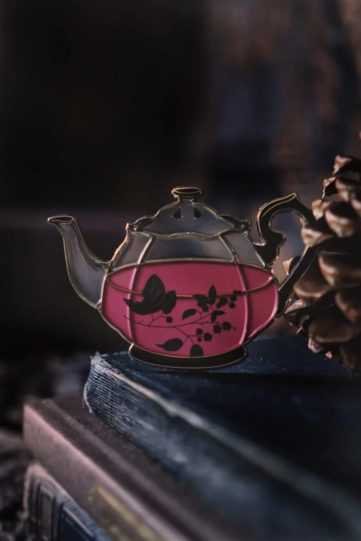 Inspired by Crimson Peak, this XL Mourning Tea pin from Lively Ghosts features translucent enamel and screen printed details of firethorn berries. A large size, it would look great on a coat, sweater, or your bag!
