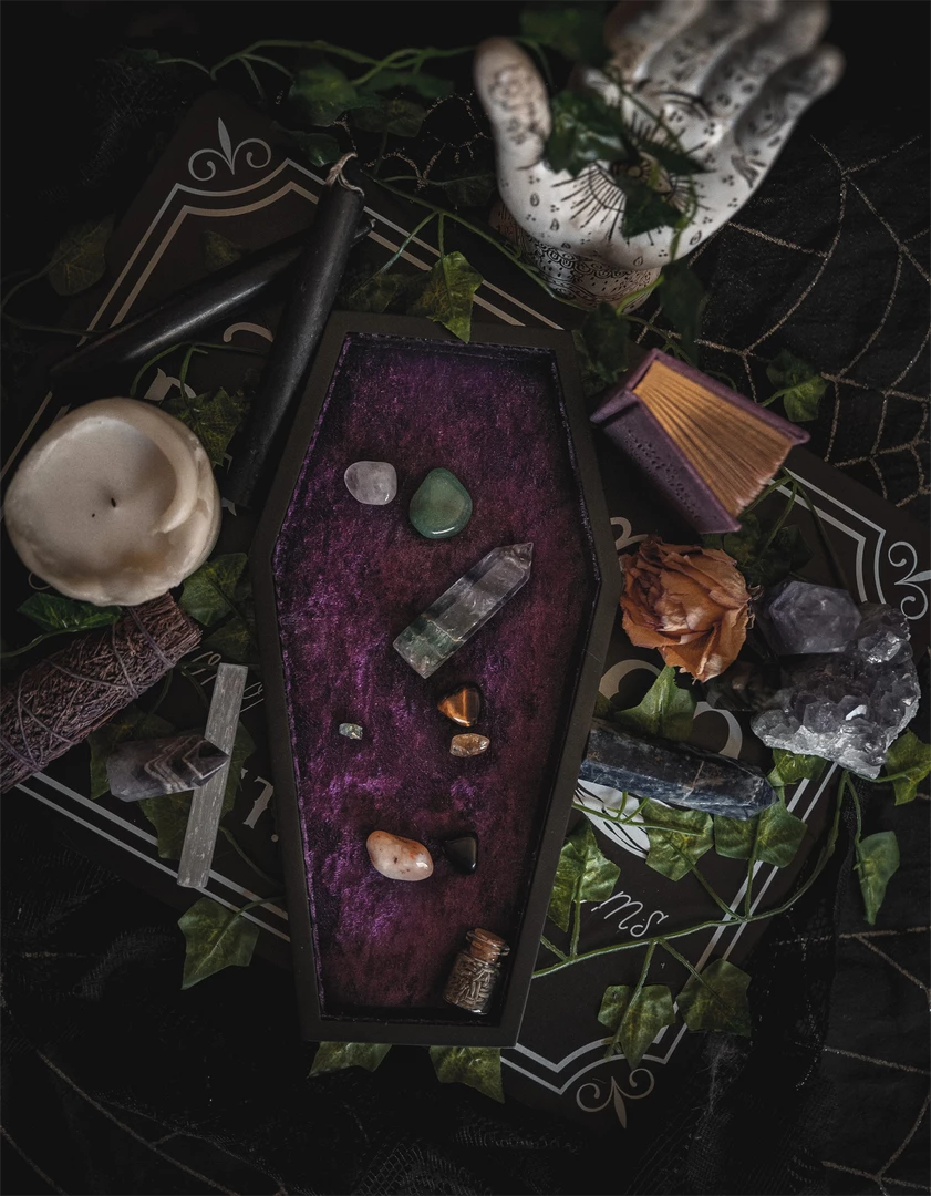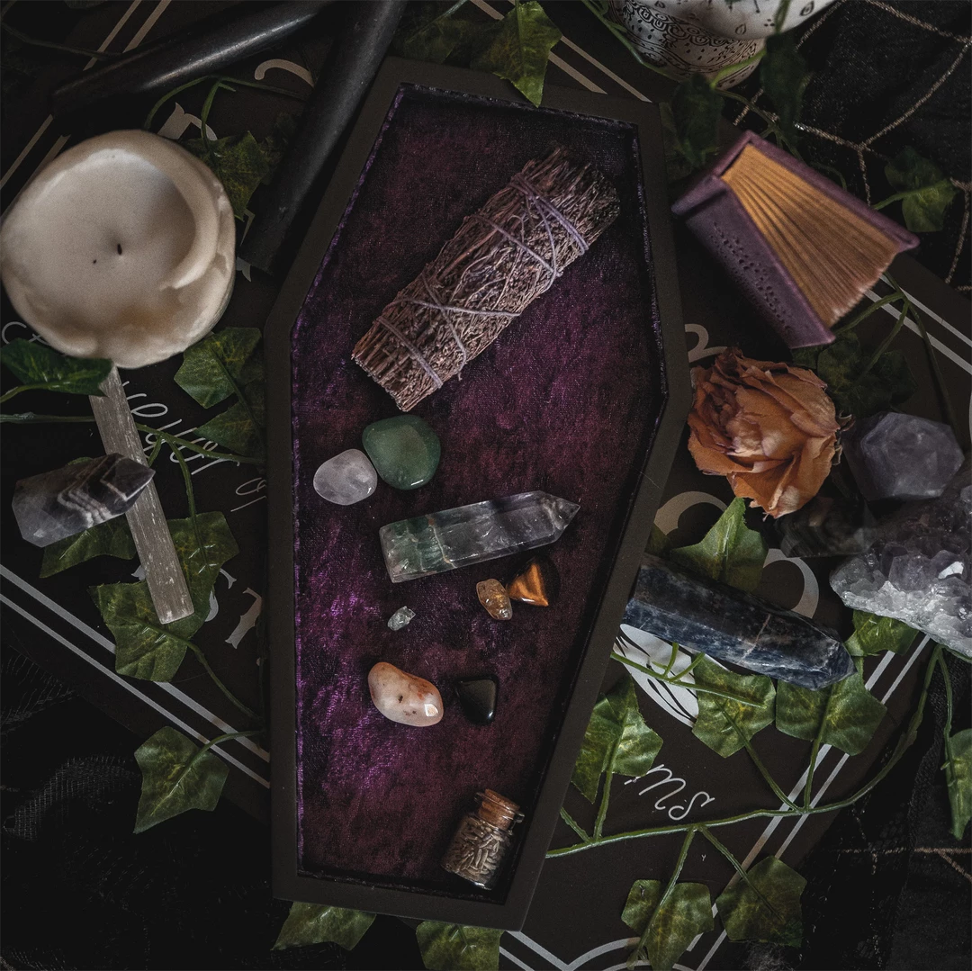These velvet coffin trinket trays from Lively Ghosts are the perfect way to keep everything organized. Made of MDF wood and lined with a dark purple crushed velvet, they’re ideal for storing jewelry, glasses, keys, tiny plants, potions & elixirs, perfumes, halloween candy, and more.