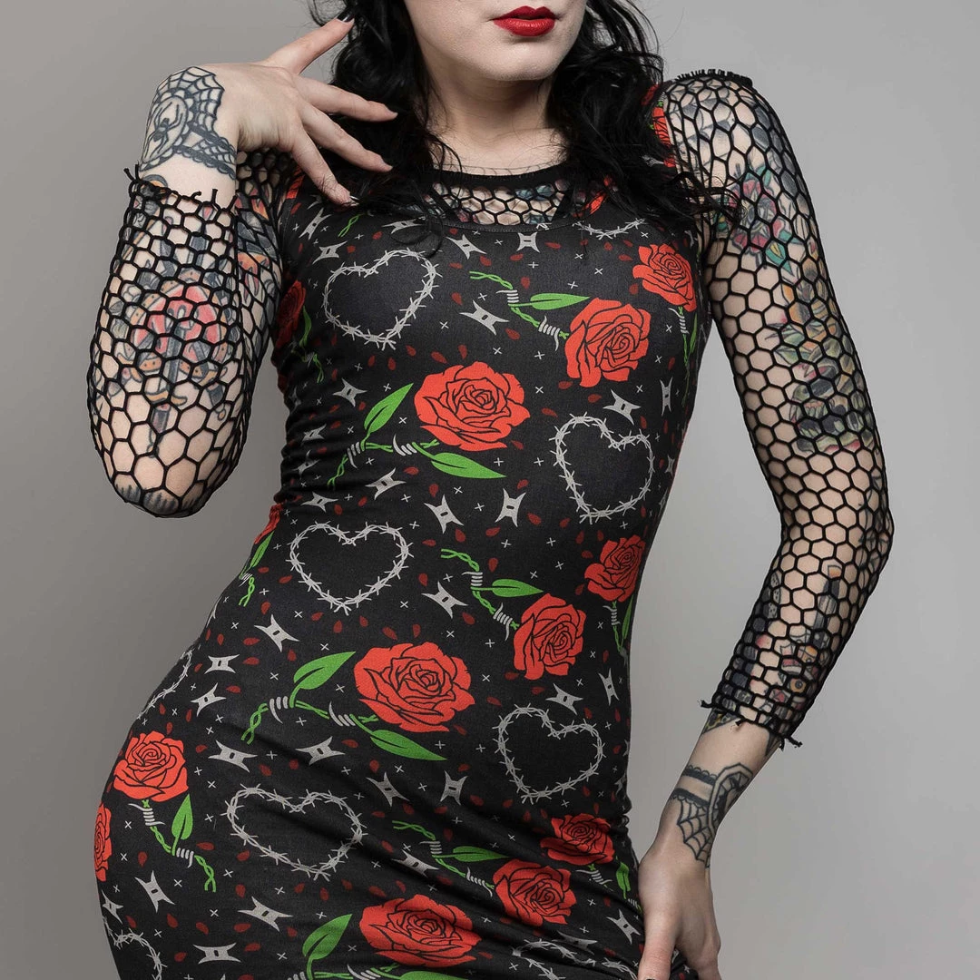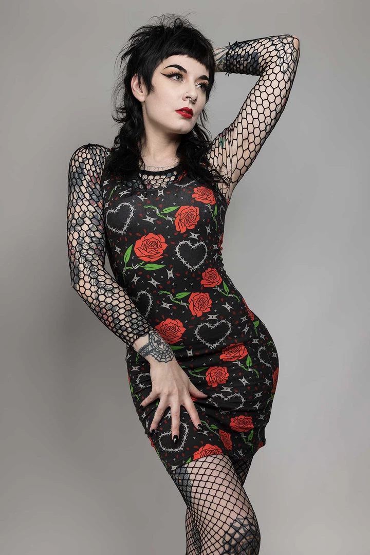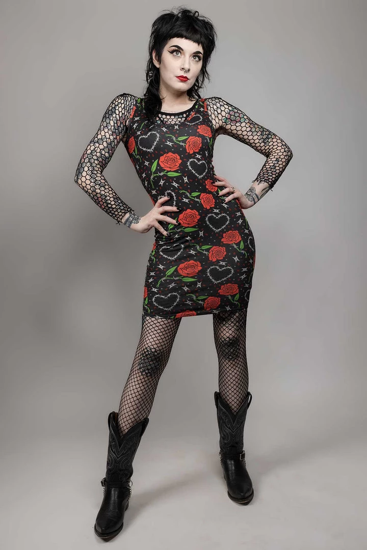 Everything’s coming up roses with our new Barbed Wire tank dress! This stretchy, comfy tank dress features an allover print of red roses and barbed wire hearts. It looks amazing paired with boots and fishnets!